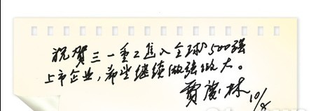 三一重工以215.84億美元市值首次榮登FT全球500強(qiáng),引來各方持續(xù)關(guān)注。中央領(lǐng)導(dǎo)以及各級黨政機(jī)關(guān)、社會各界紛紛來信來函,對三一表示祝賀。8月10日,中共中央政治局常委、全國政協(xié)主席賈慶林的親筆來函,讓三一人備受鼓舞。他說:“祝賀三一重工進(jìn)入全球500強(qiáng)上市企業(yè),希望繼續(xù)做強(qiáng)做大。”